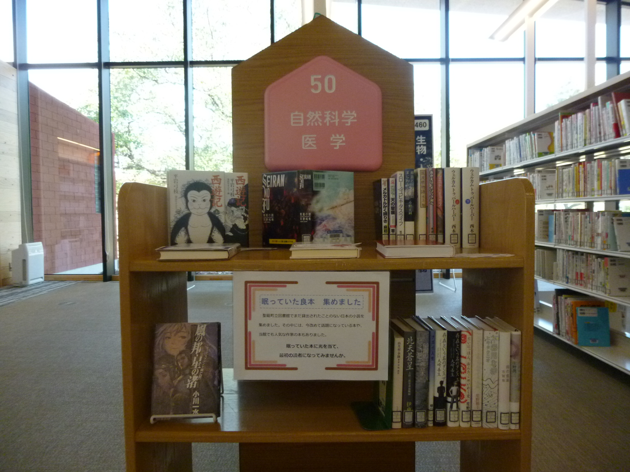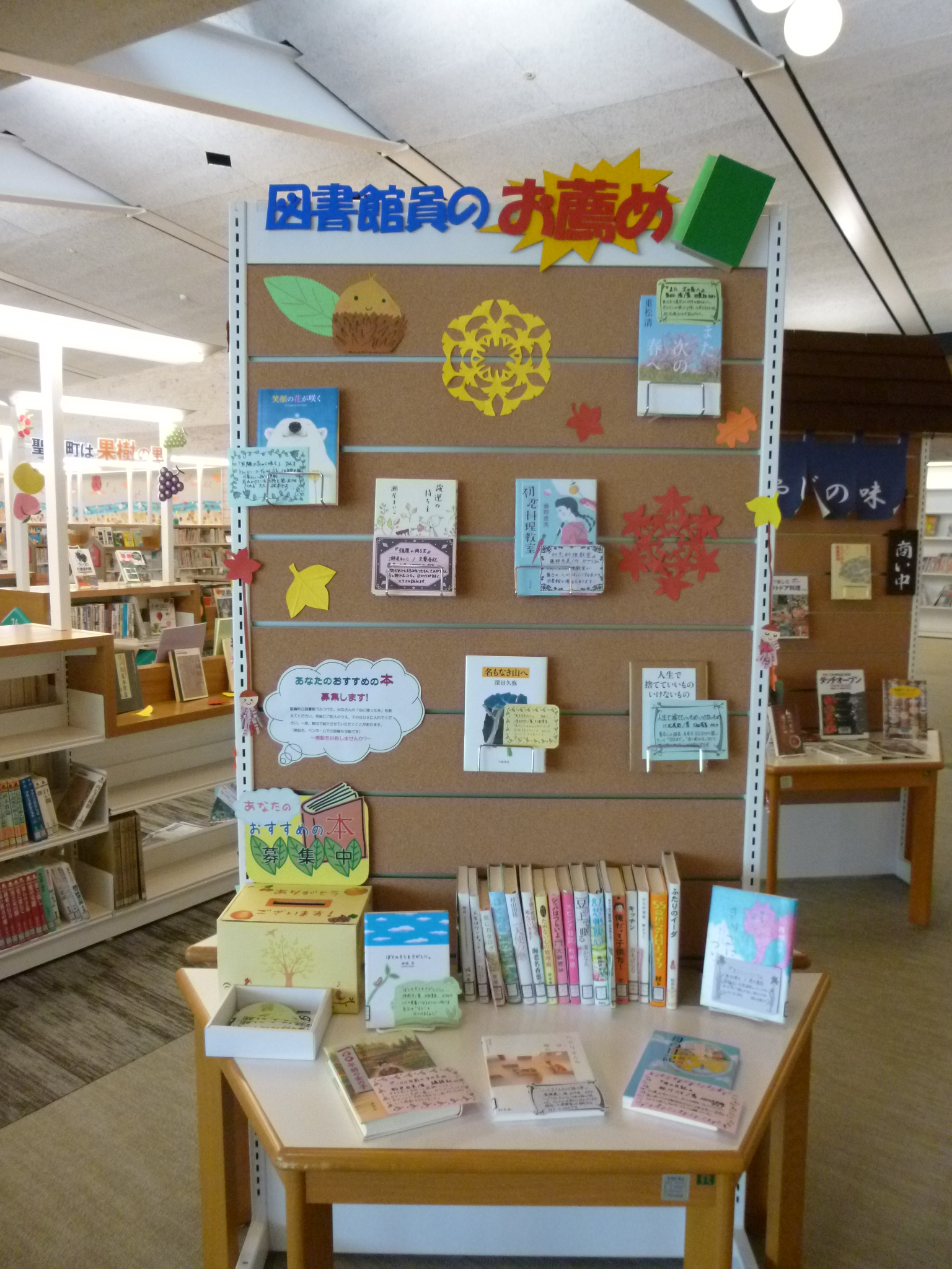 おすすめの本を、図書館内の展示スペースで