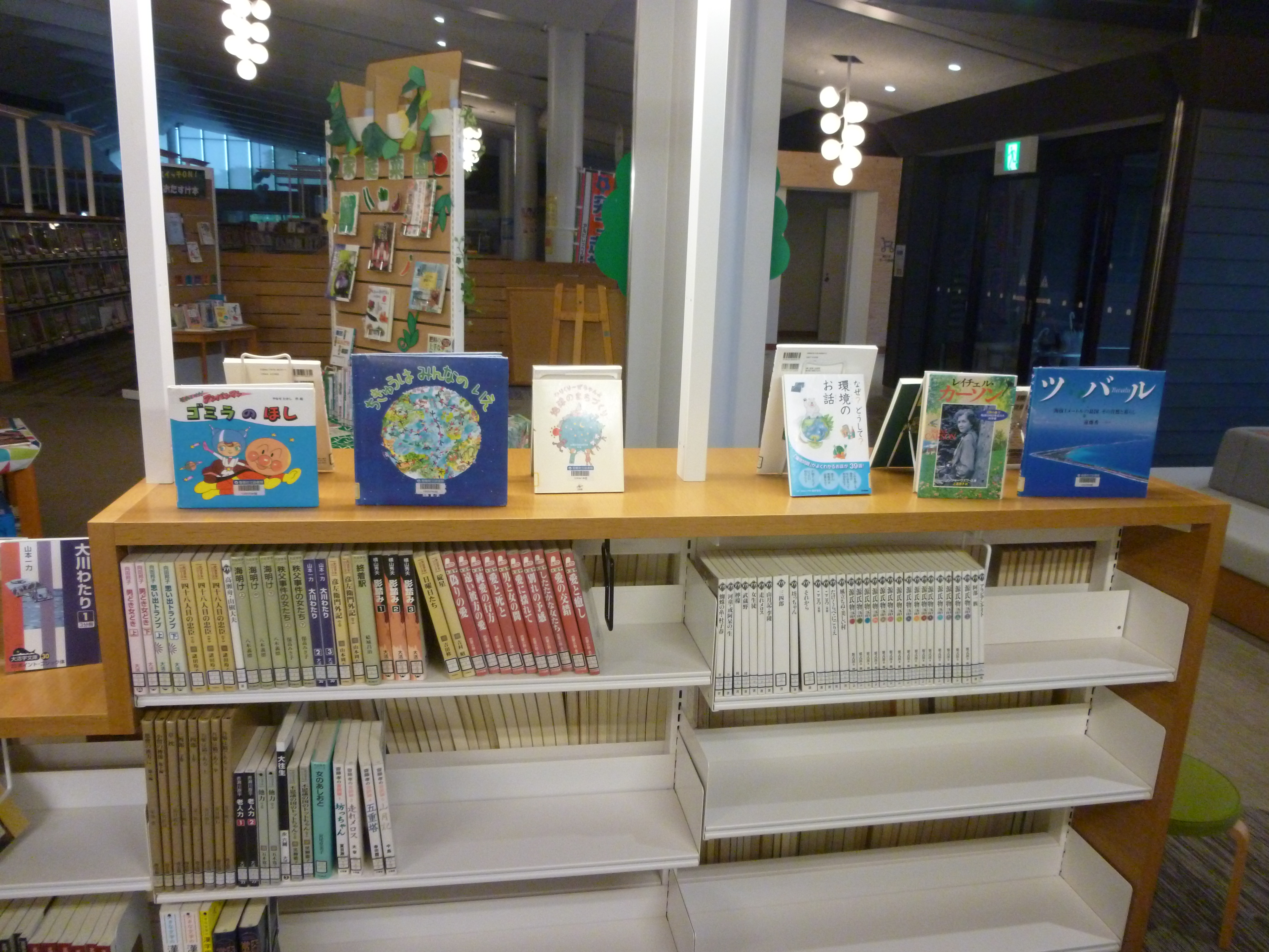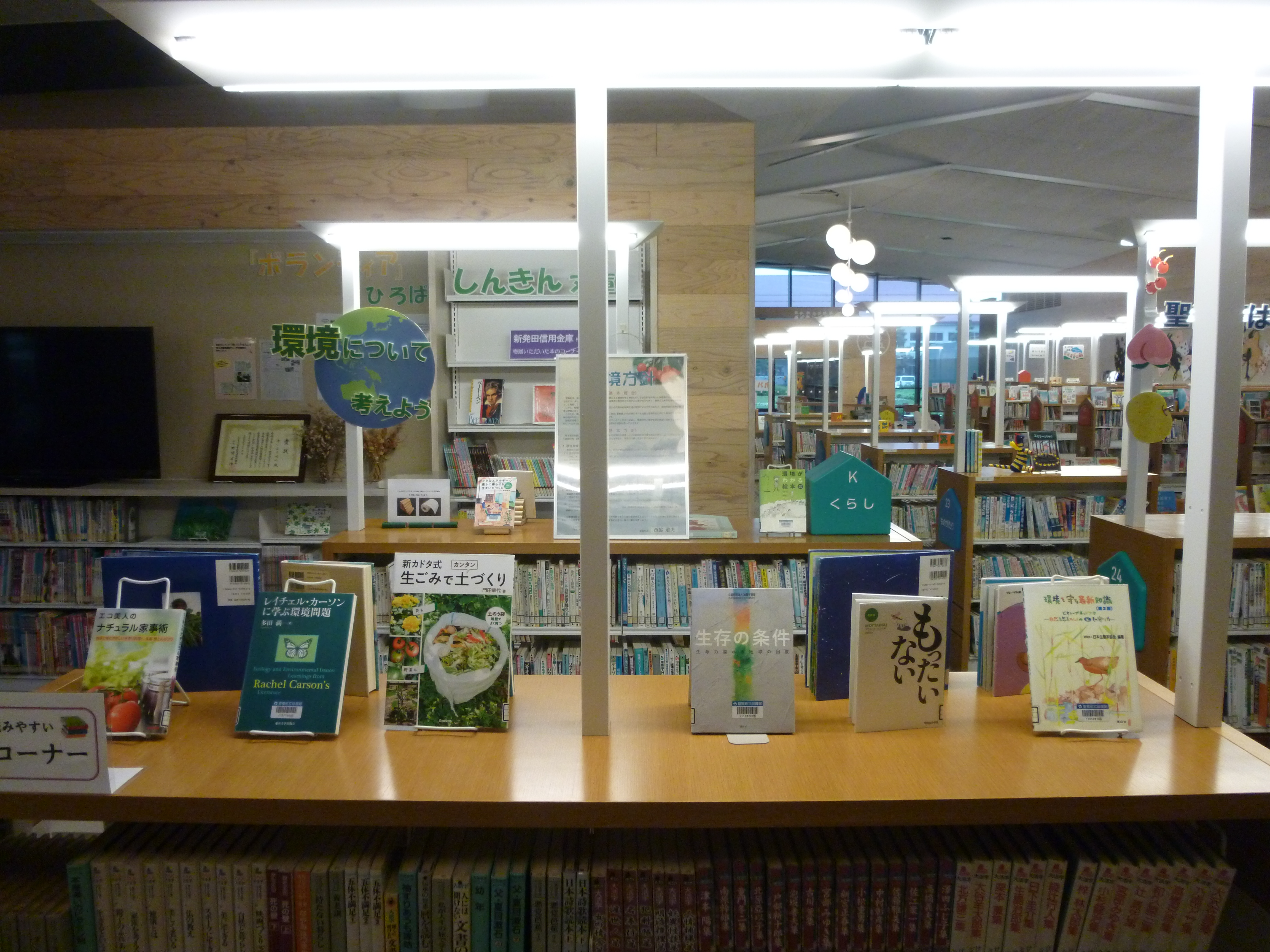 飲食コーナーのそばにリサイクルやエコの本を集めた