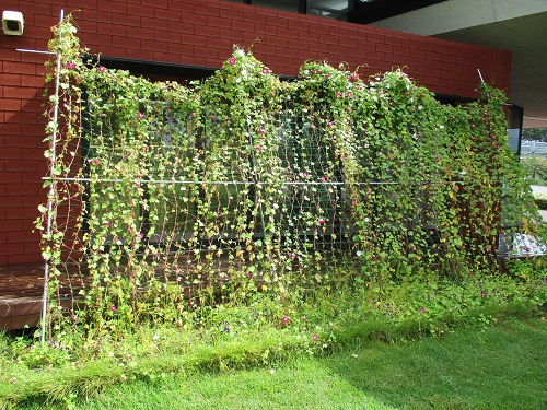 毎年おはなし室の窓の外にアサガオのグリーンカーテンを設置しています。