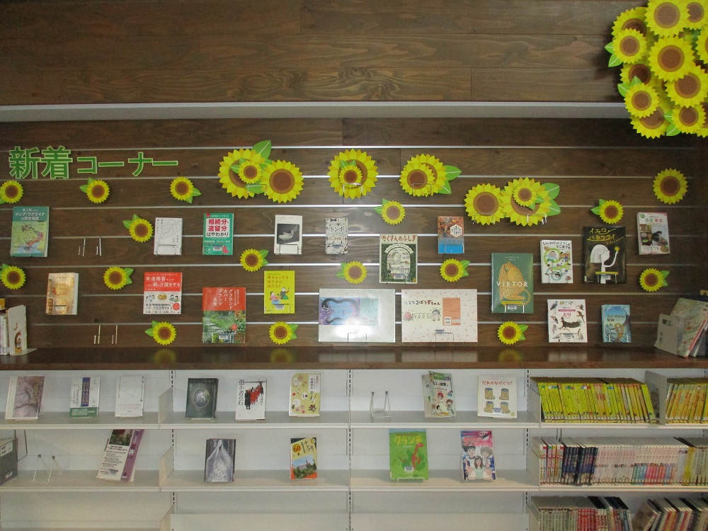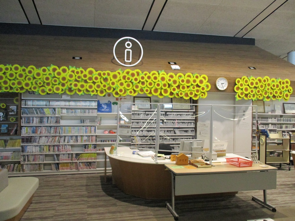 カウンター周りや新刊コーナーはひまわりでいっぱいです。