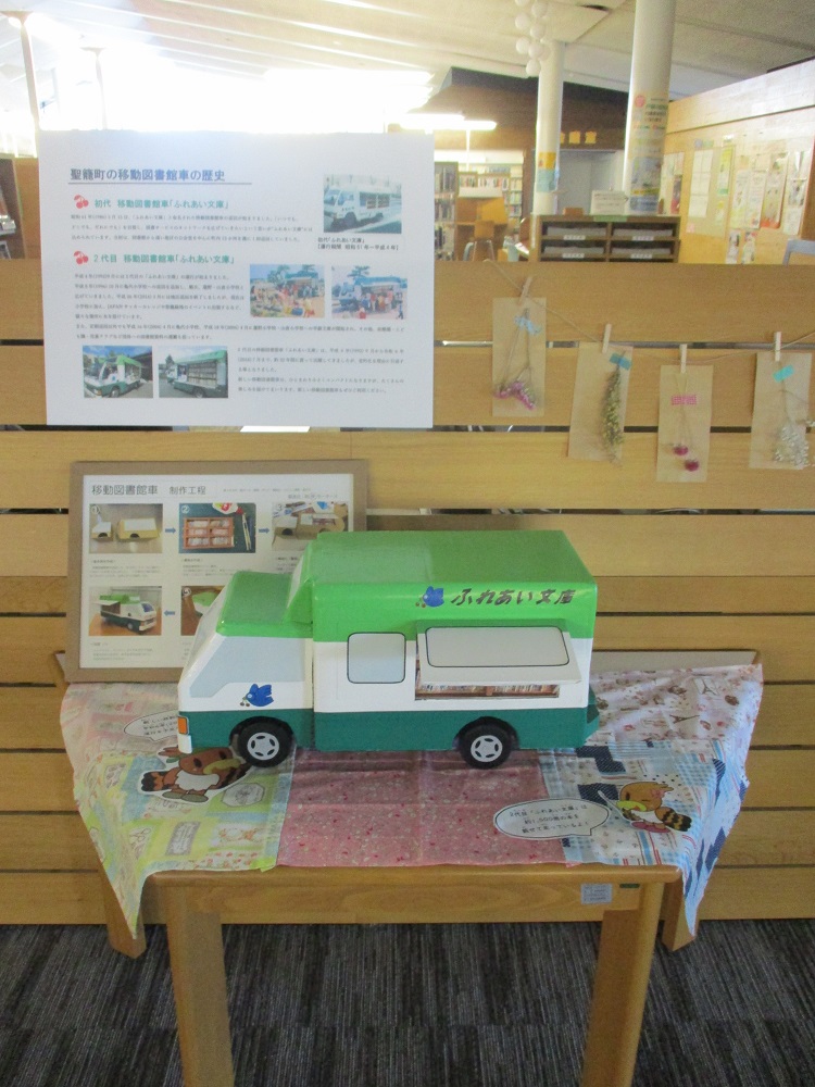 「図書館のあゆみ展」で好評でした移動図書館車の模型は、正面に場所を移して継続展示中です。