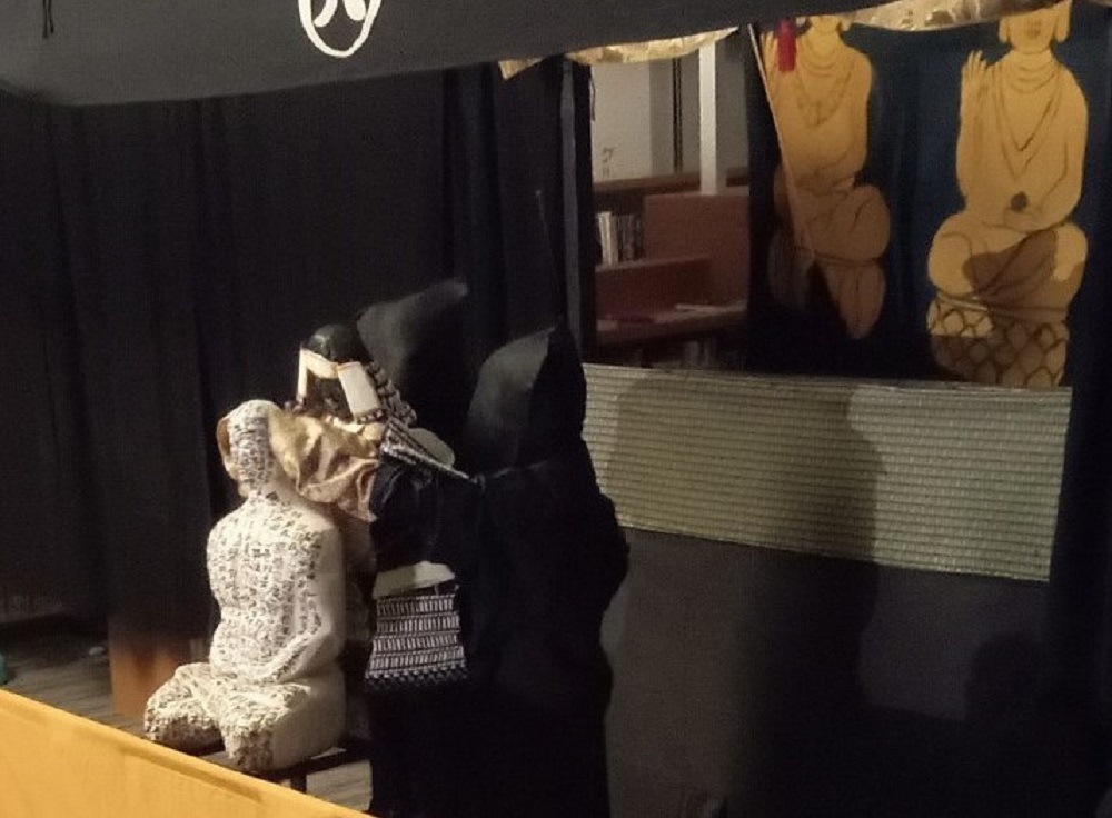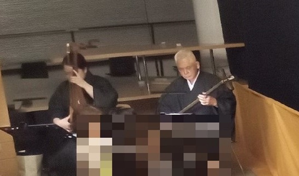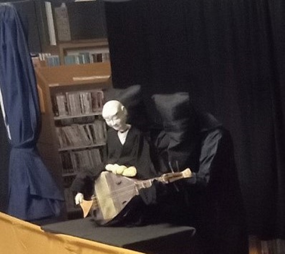 ⑤物語は三味線を弾き語る太夫と、芳一の演奏と声を担当する琵琶奏者の2名により進行していきます。通常、猿八座の公演は太夫が一人で弾き語るのが主流ですが、琵琶奏者が主人公の「耳なし芳一」ならではの趣向です。(写真の一部を修正しています)