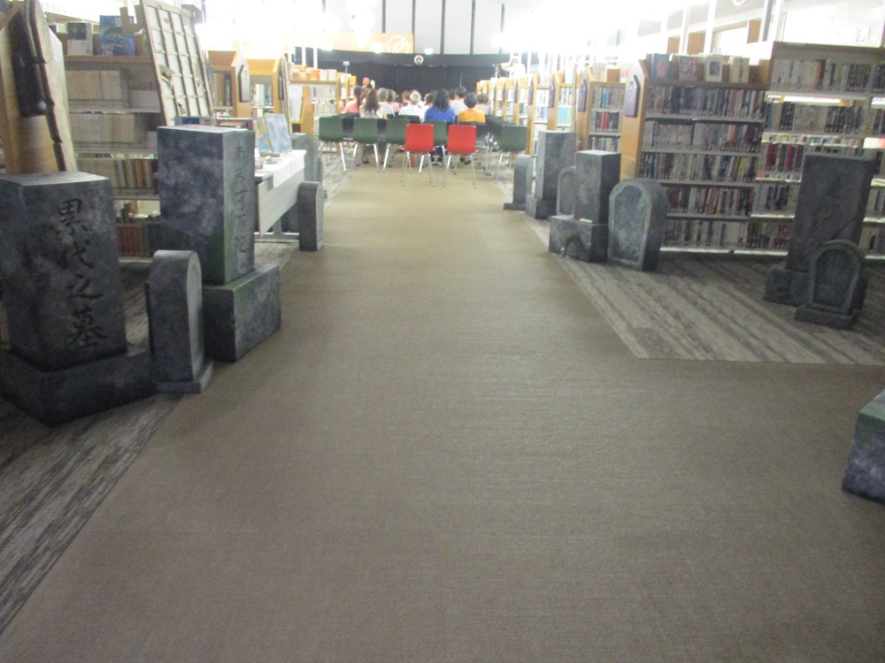 社会教育課が「きも試し」用に作成したお墓のオブジェなどを用いて、館内も不気味な装飾が施されました。
