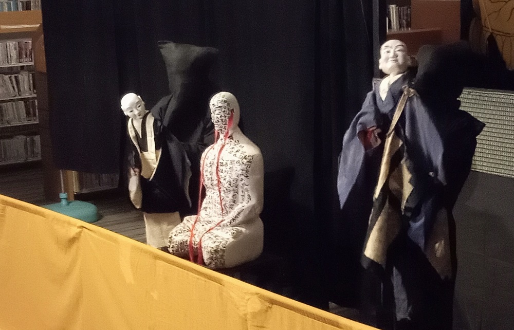 夜間の図書館で舞台設営をして行う事業という珍しい試みでありましたが、95名のご参加をいただき、それに応える猿八座さんの熱演で異世界に迷い込んだような雰囲気の中、小泉八雲原作による「耳なし芳一」が上演されました。