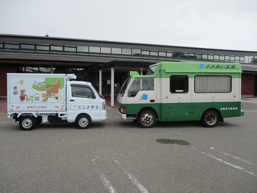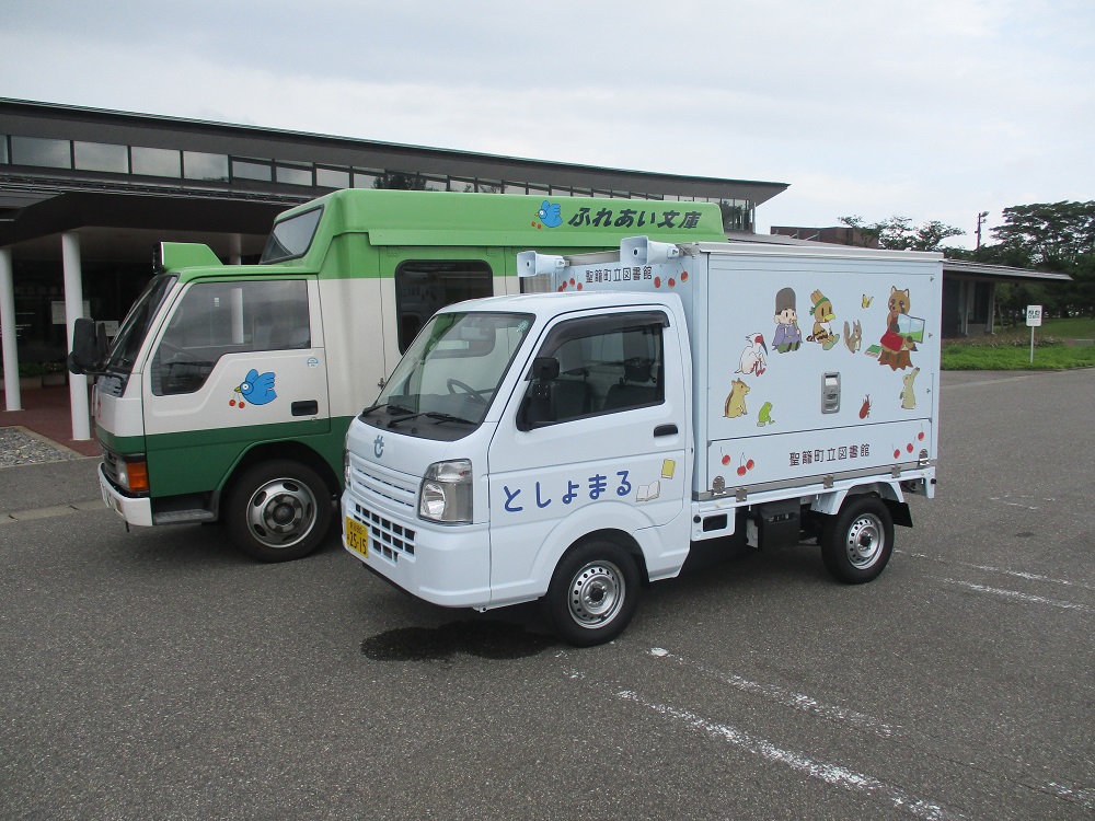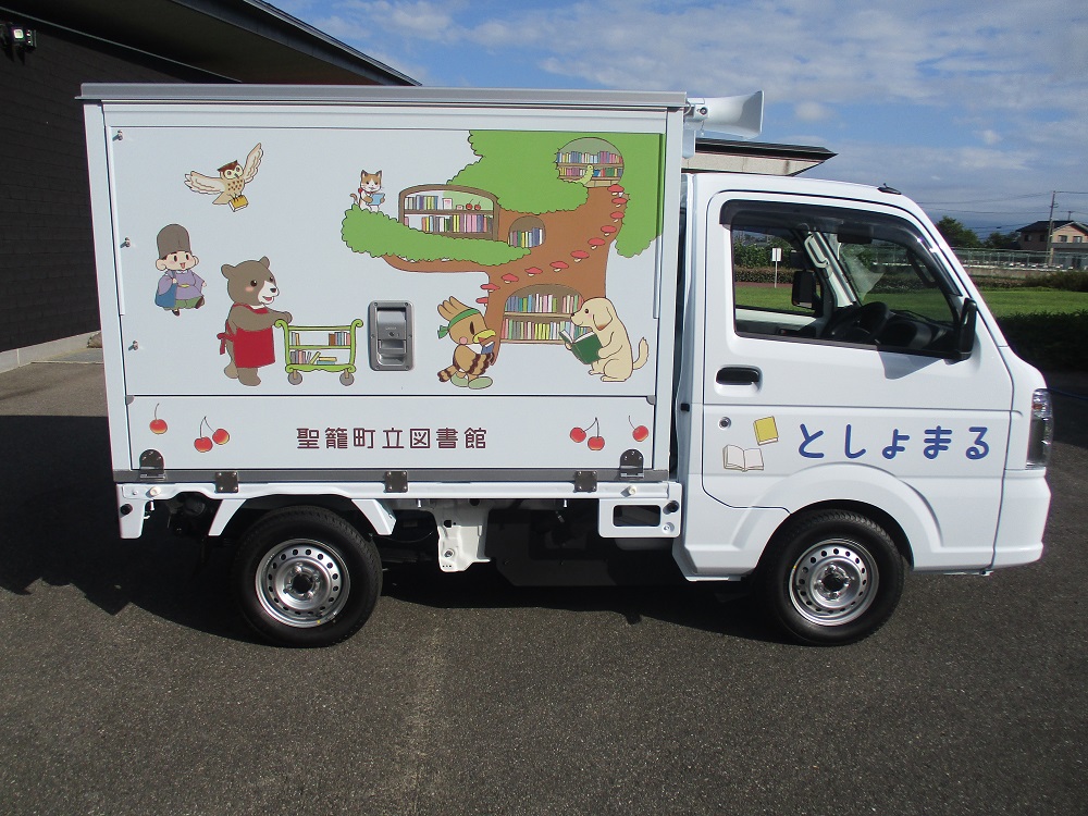 新移動図書館車「としょまる」は軽トラックの改造車であり、本の厚さによりますが、500~600冊を収蔵できます。車体の色は町旗をイメージした青色です。