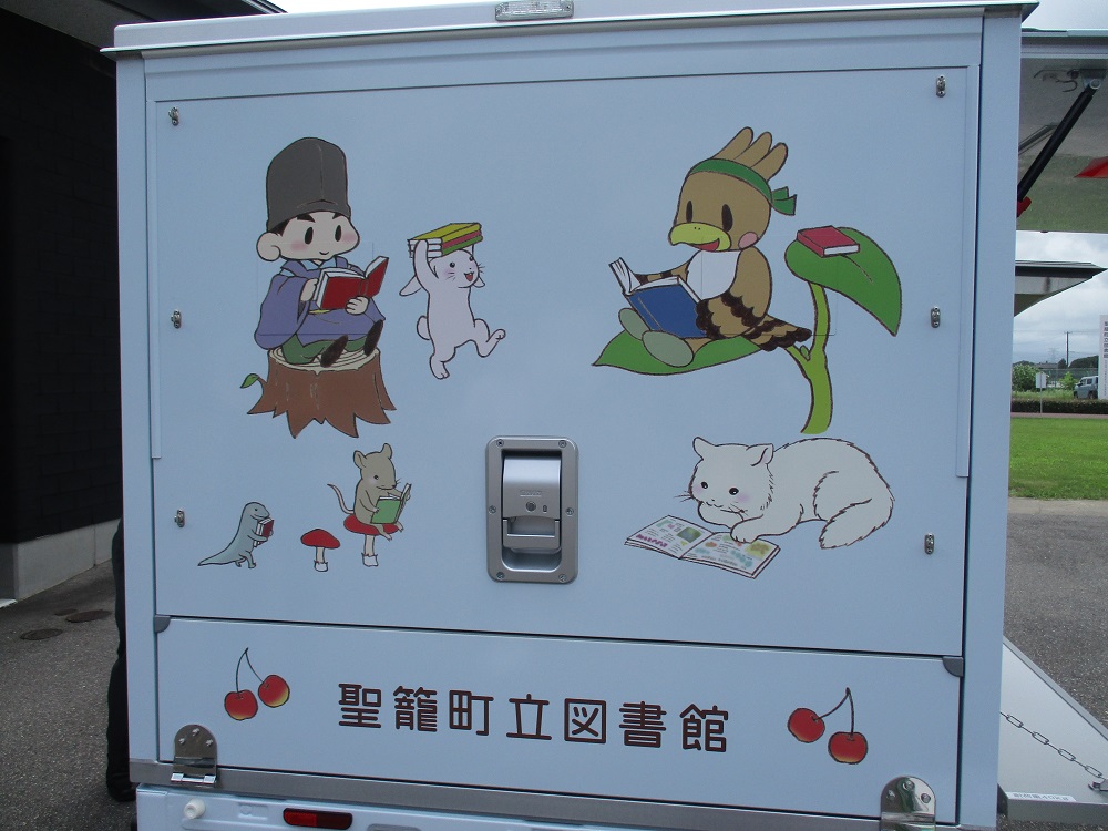 としょまるの車体には社会教育だよりの漫画連載でおなじみの高橋明公子さんのデザインにより、緑丸や百合若が動物たちと楽しそうに本を読んでいる姿が描かれています。