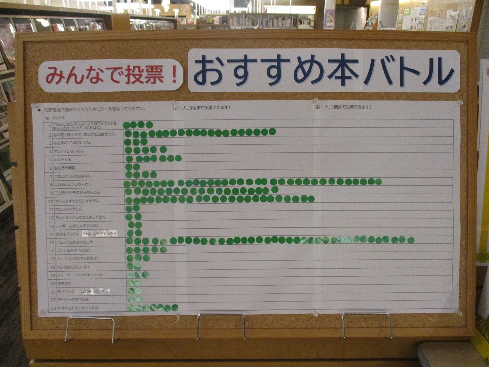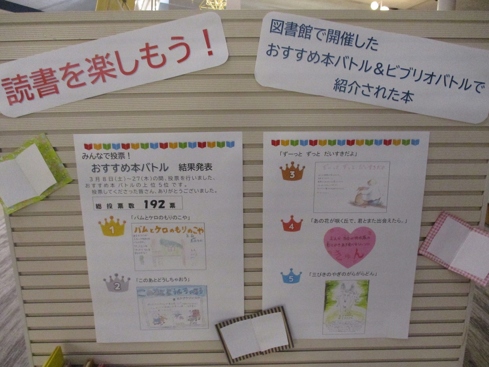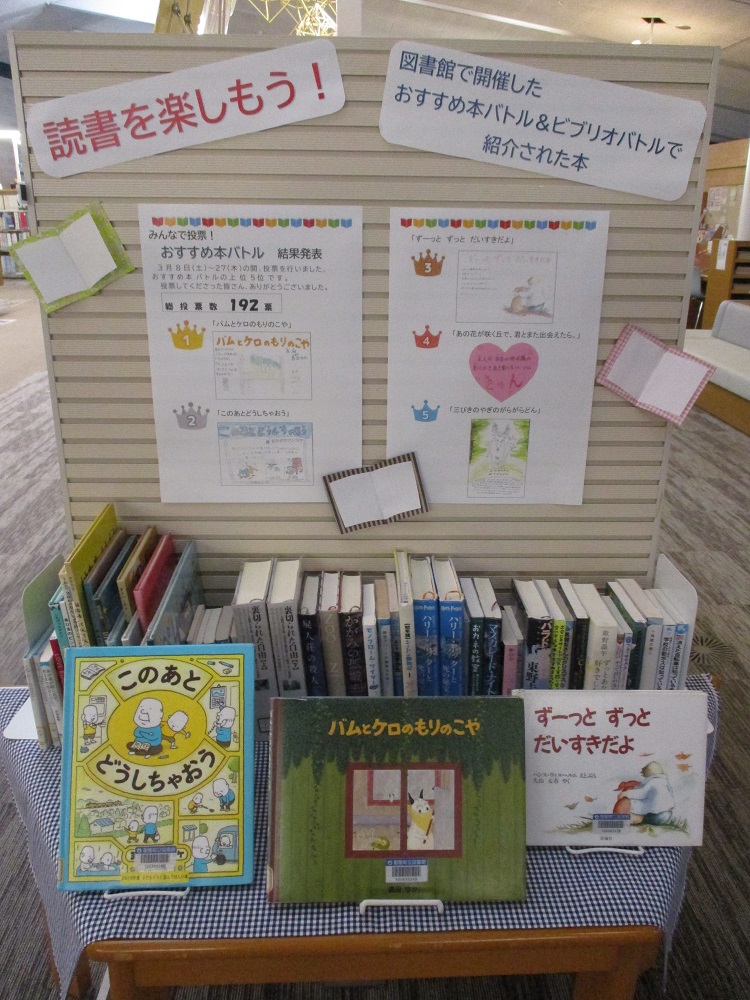 3月8日から27日の間、開催していました「みんなで投票!おすすめ本バトル」に、沢山の投票をいただきありがとうございました。今回の「チャンプ本」を含め、5位までの結果と人気が高かった本を展示しています。あなたの選んだ本はありましたか?