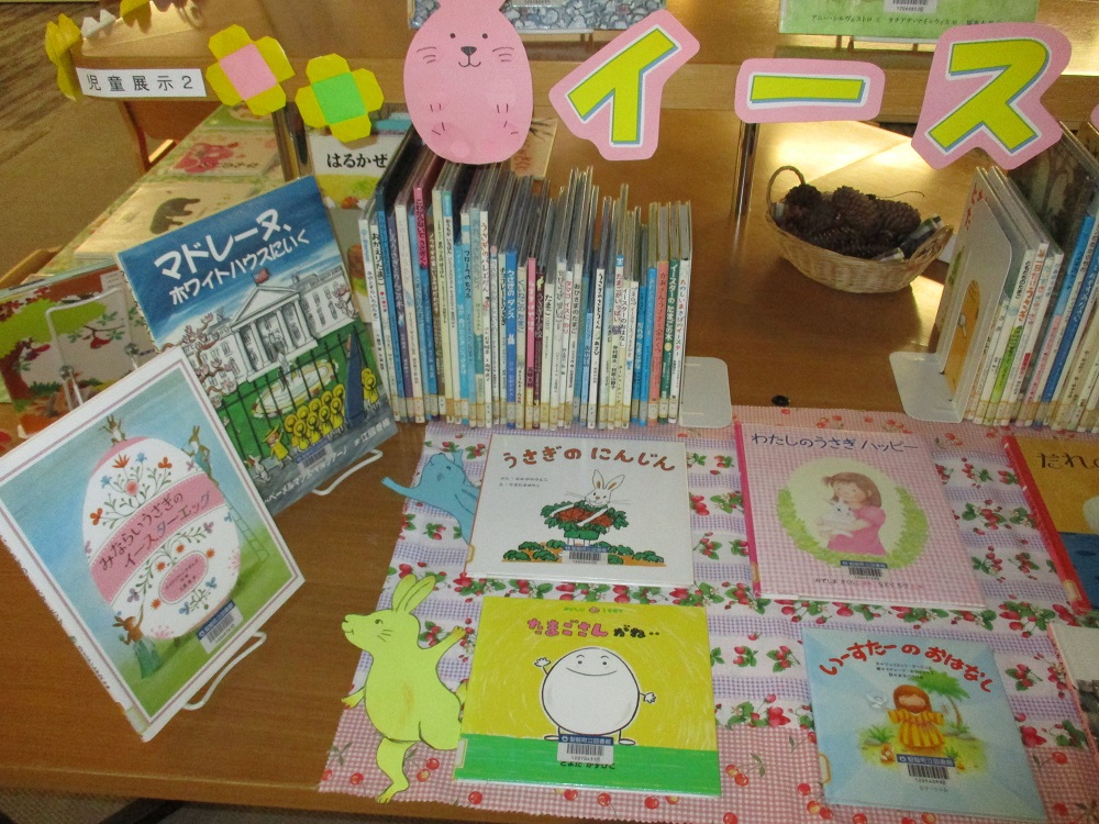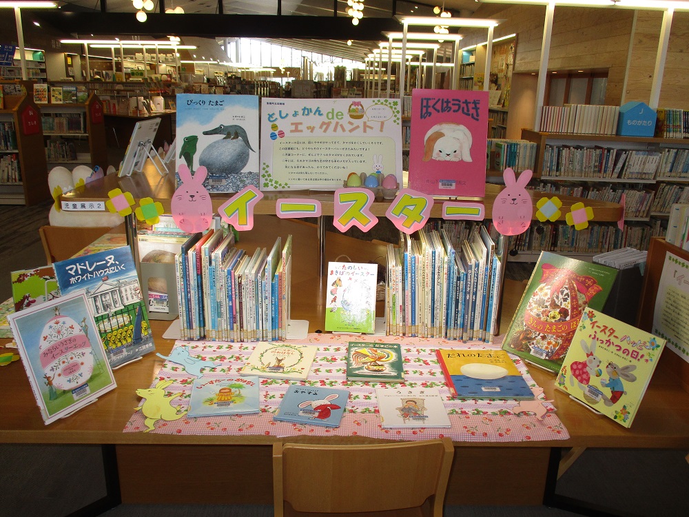 イースターはキリスト教がもとになっているお祭り。当日はうさぎが隠したタマゴを探し出す「エッグハント」などのゲームなどで楽しく過ごすそうです。図書館でも、児童コーナーに隠されたタマゴを見つける「としょかんdeエッグハント!」を開催中です。こちらはイースターの主役、ウサギやタマゴの絵本を集めたコーナーです。