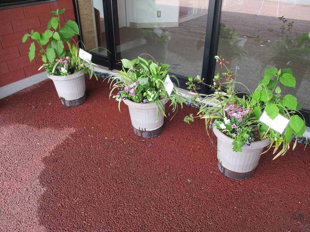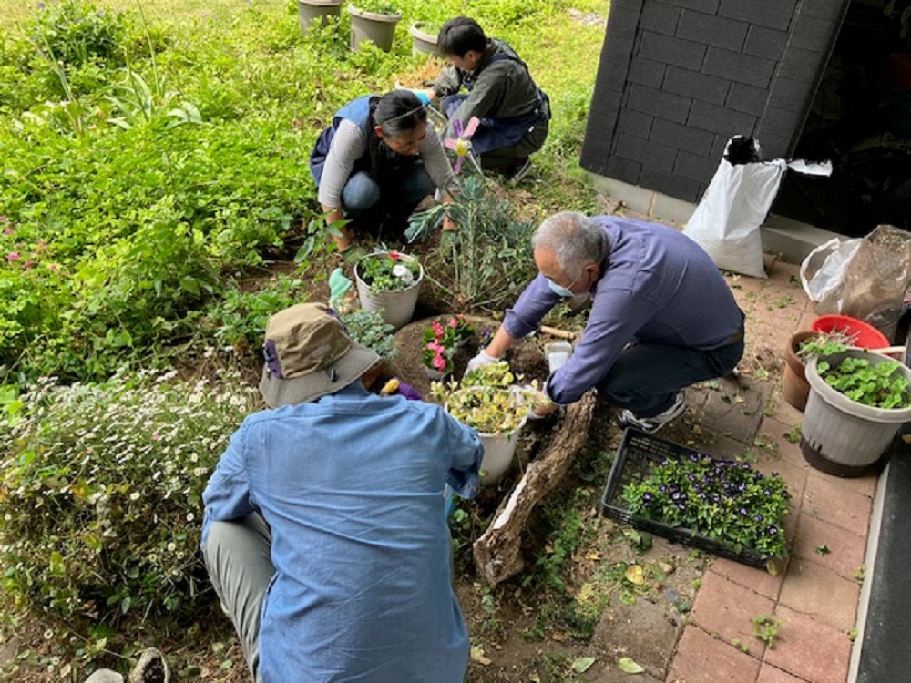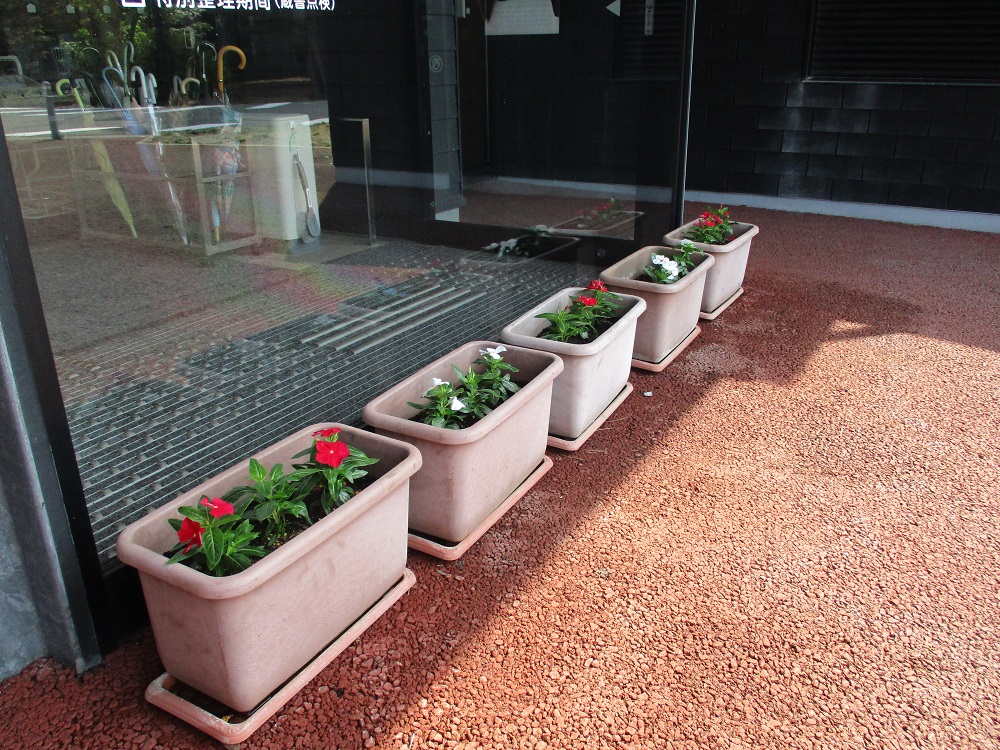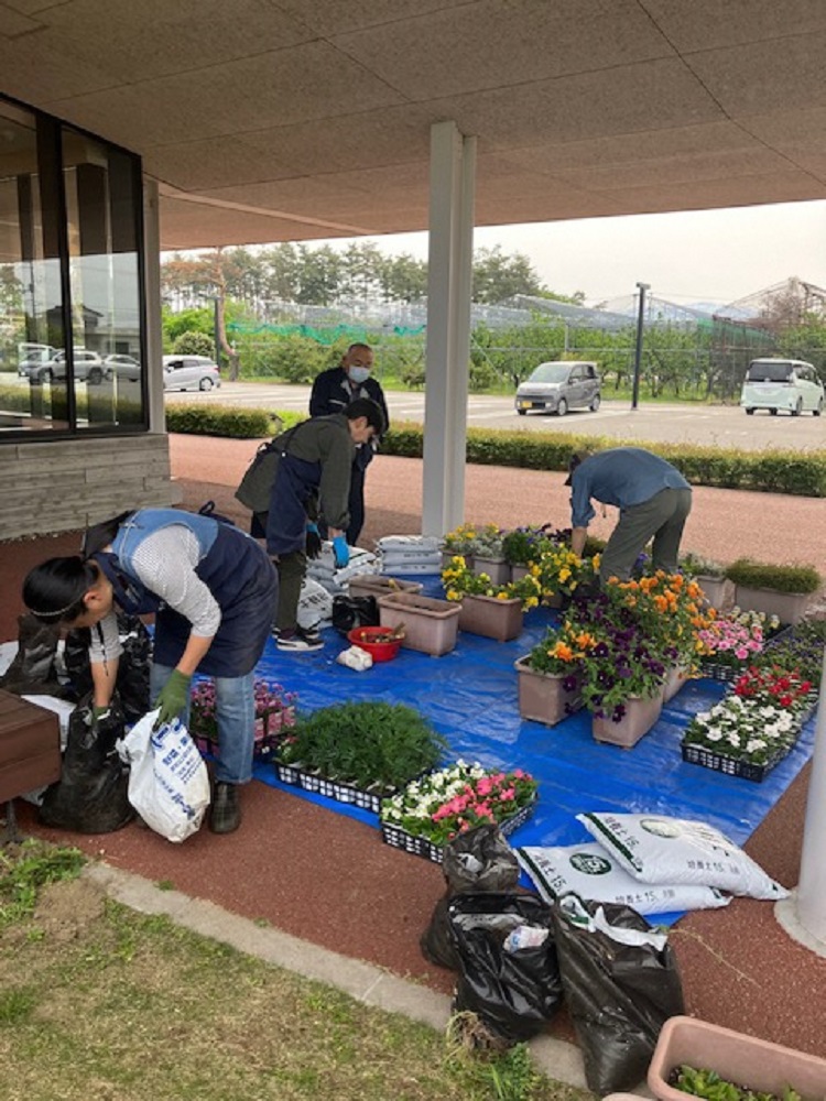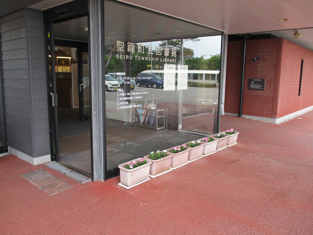 ボランティア団体のうち、外構管理の協力をいただいている図書館ネットiせいろうの皆さんが、花壇や植木鉢、プランターの植え替え作業を行いました。