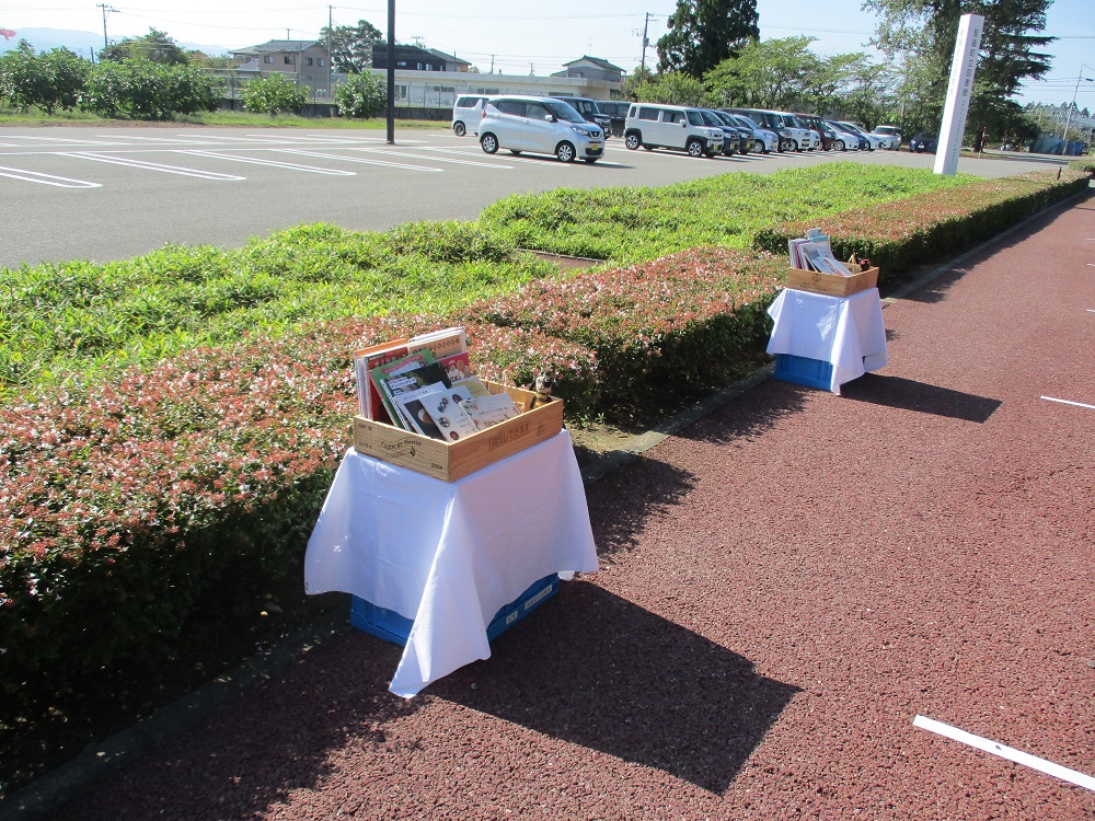 移動図書館車も正面玄関前に配置され、軒先出店のブース後ろにはそれぞれ出店した内容に沿った資料が選書されました。本イベントがきっかけで初めて来館された方もおり、通常開館時の倍以上の図書利用券の新規登録がありました。