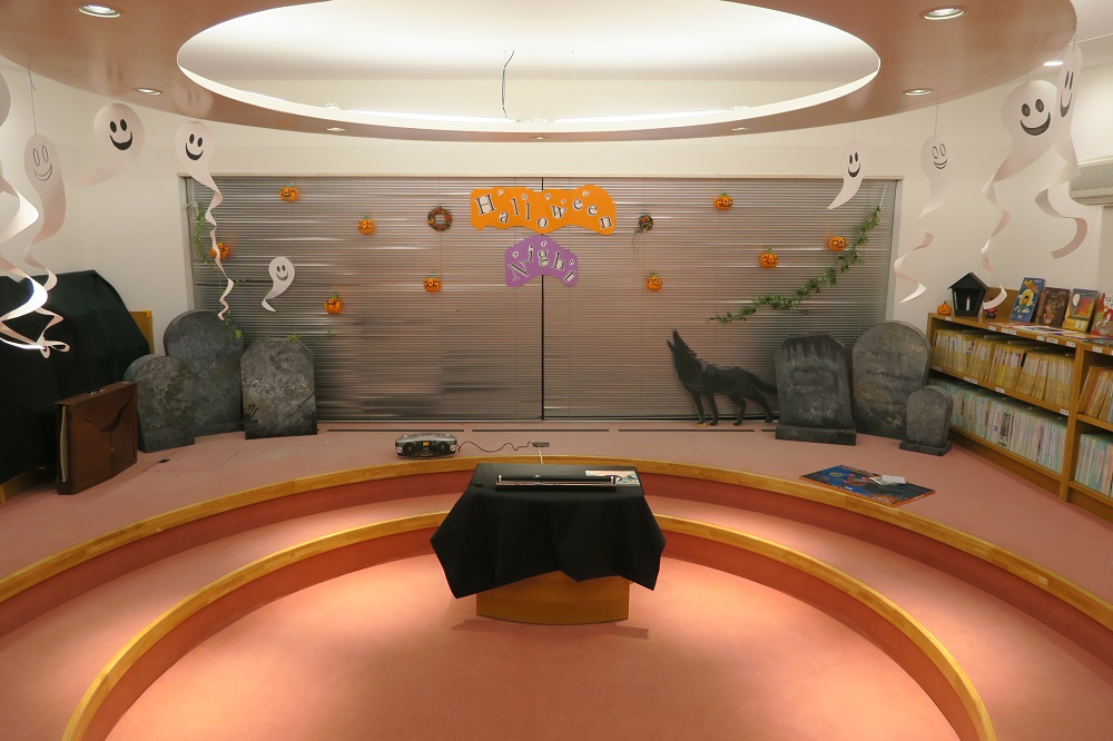 会場となったおはなし室にはおばけや墓石などの装飾が・・・。