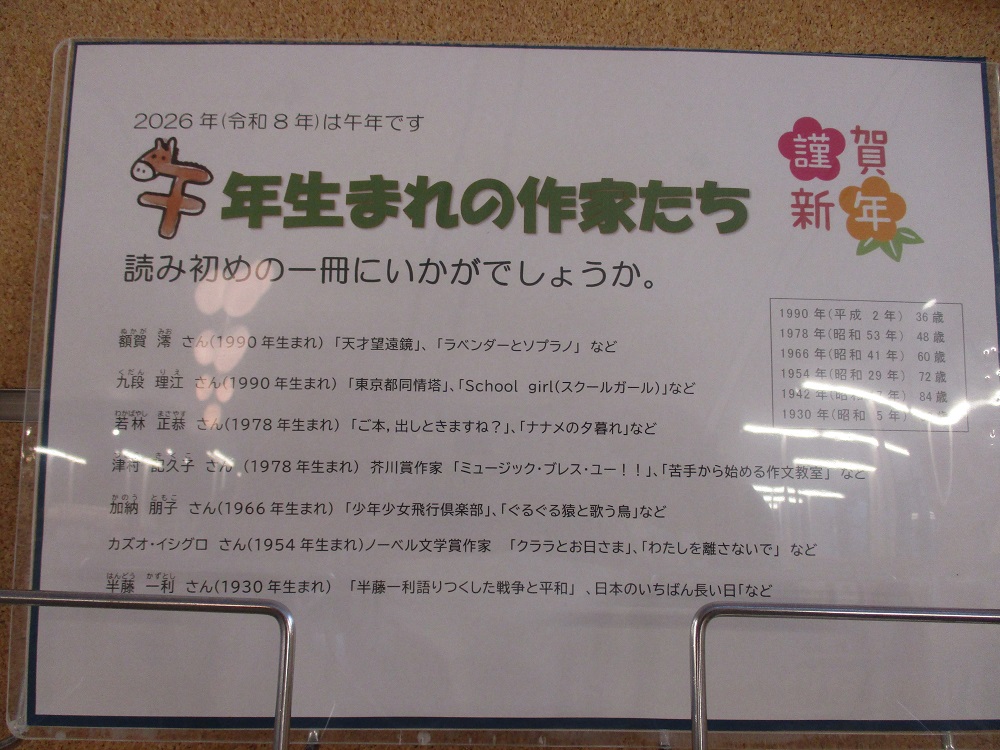 ティーンズコーナーも、「午年生まれの作家たち」、「この冬に読んでほしい作品」といった展示を行っています。