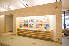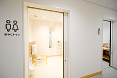 トイレは2カ所、正面入り口はいって右手と、インフォメーション脇にあります。おやこトイレ、授乳室、オストメイト対応のだれでもトイレもご用意しています。